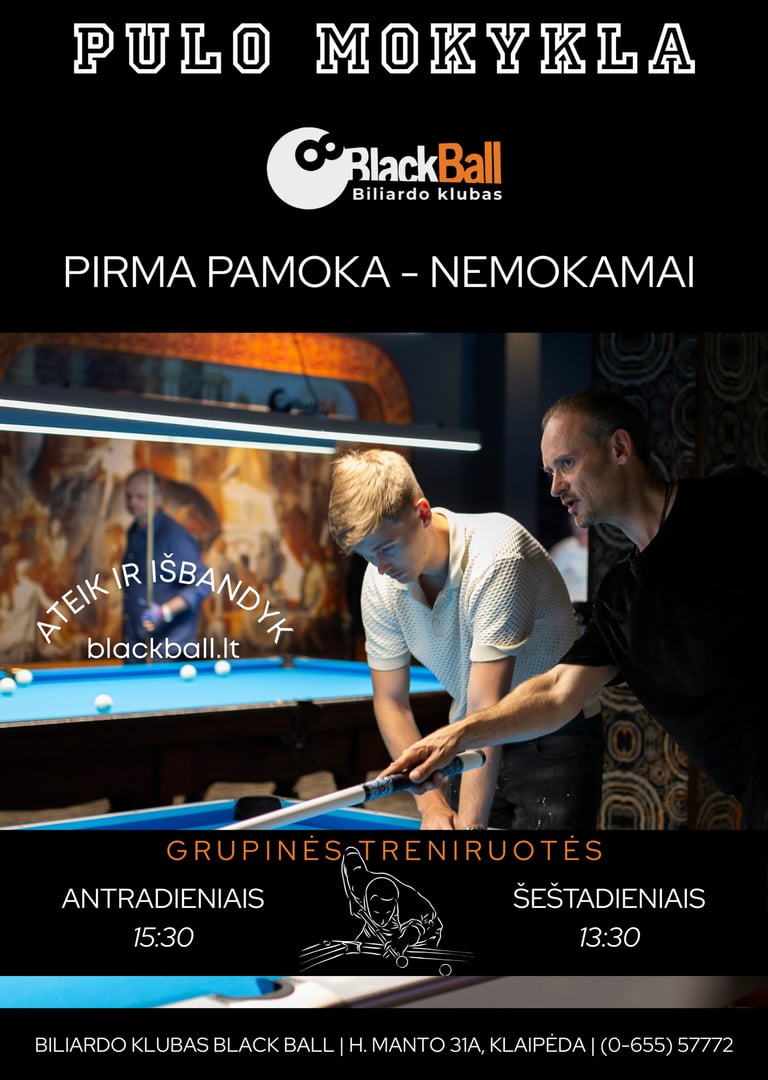 Kviečiame visus norinčius išmokti žaisti biliardą. Vedame individualias bei grupines treniruotes. Pas mus galėsite mokytis pulo, piramidės bei snukerio subtilybių. Kreipkis net jeigu tu ir ne naujokas, bet nori patobulinti savo turimus įgūdžius ar išmokti kažką naujo.